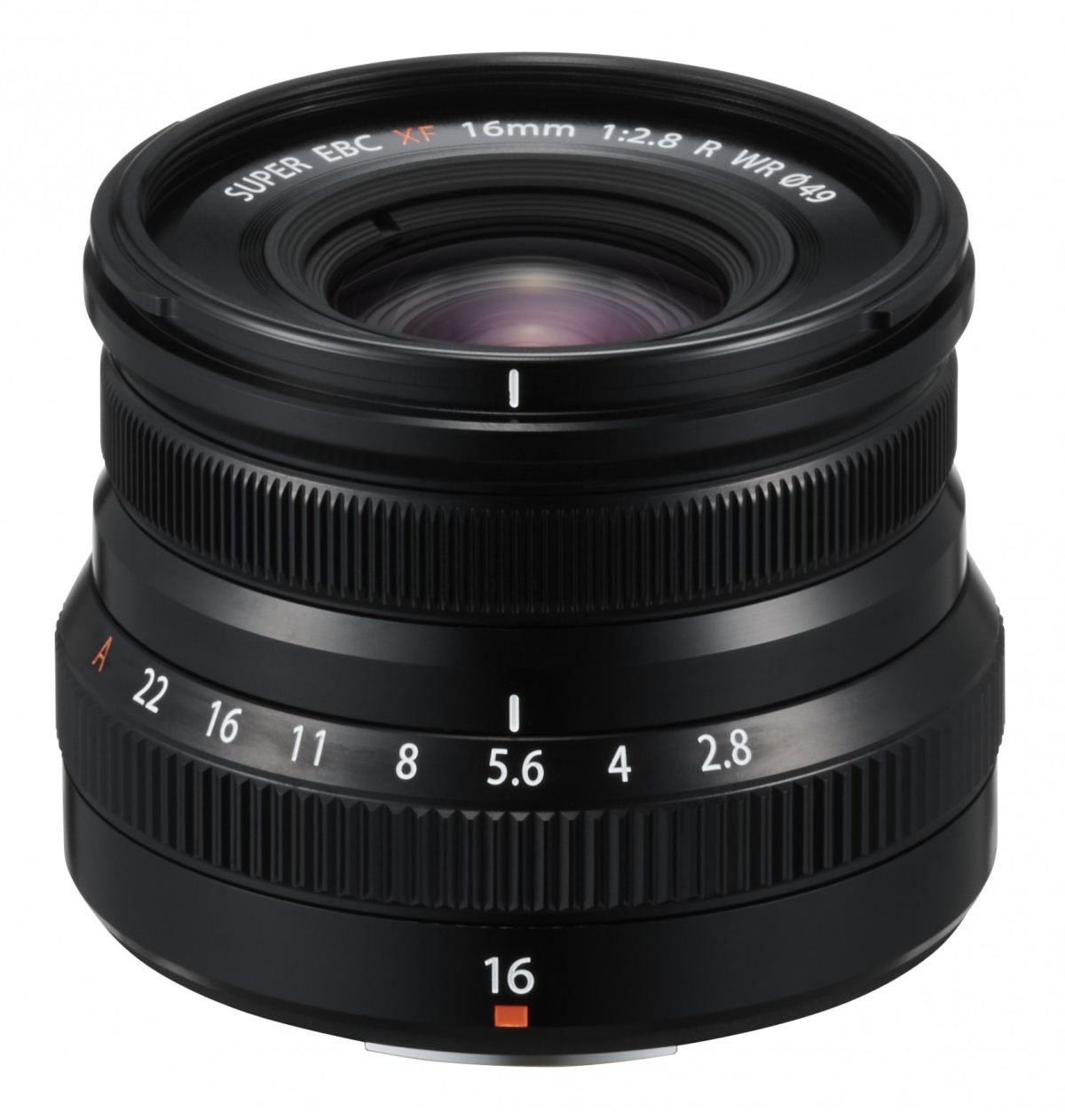 Jedan od povoljnijih Fuji prime objektiva na predstavljanju - Fujinon XF 16mm f/2.8 R WR. Ova minijatura od objektiva sadrži 10 elemenata u 9 grupa, od kojih su dva asferična, a svi su prekriveni Super EBC premazom, u cilju umanjenja odbljesaka i efekata ghosting-a. Fuji 16mm f/2.8 opremljen je koračnim AF motorom i smešten u zaptiveno kućište, čiji je prečnik filera 49mm. Dijafragma je realizovana u vidu 9 zaobljenih listića. Kada se montira na Fuji X-mount telo, ekvivalentni raspon objektiva Fujifilm 16mm f/2.8 iznosi 24mm. Dostupan je u crnoj i srebrnoj boji.